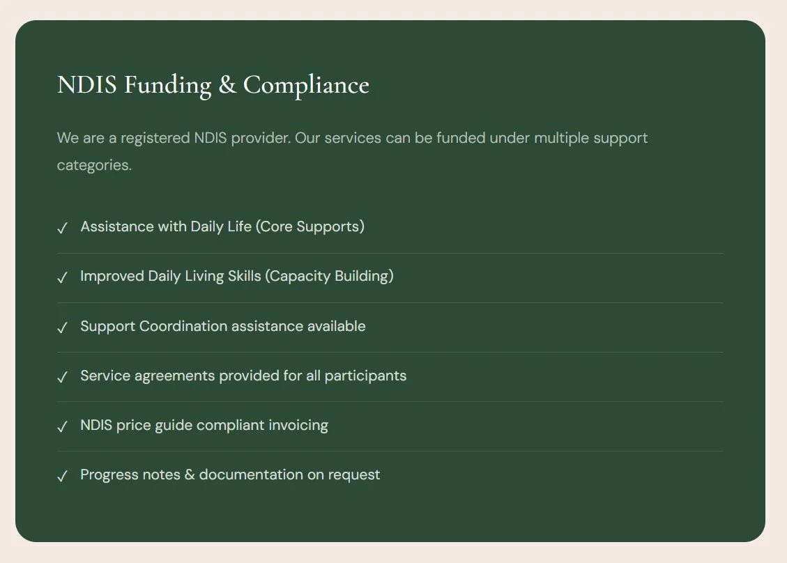 Personalised in-home meal preparation for NDIS participants using Daily Activities or Improved Daily Living supports. We work within your plan and budgetReliable, consistent meal services for Supported Independent Living homes. We collaborate with your support team to ensure participant choice and dignity around food.Cook, Gather, Enjoy